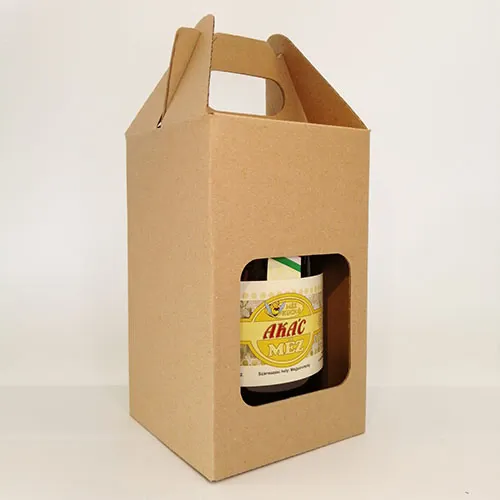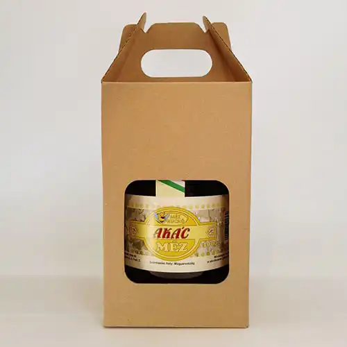 Egyszerű, természetes, de biztonságos csomagolást nyújt ez a kartondoboz, amelybe az 1 kilogrammos mézeink férnek bele. Az ablakos kialakításának köszönhetően azonnal látszik mi van benne, jó érzés így átadni, végülis nem zsákbamacskát árulunk, ugye. A karton anyaga elég erős ahhoz, hogy a mézet megtartsa, akár úgy is ha a doboz fülénél fogjuk meg.