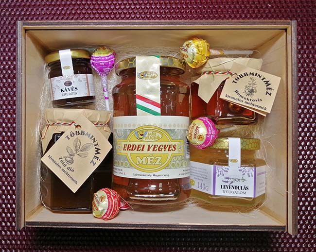 A legpraktikusabb, legnagyobb, legértékesebb. Ez az ajándékötletünk viszi a prímet, ez nem kétséges. A legfinomabb mézeinkből (és néhány fajta lekvárból) lehet összeválogatni egy doboznyit. Ízesített mézek? Különleges mézek? Gyógyhatású termékek? Bármi a dobozba kerülhet, így a végén tökéletes ajándékot kapunk, bárkinek is szánjuk.