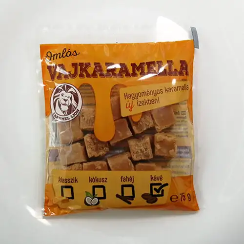 Összetevők: cukor, glükóz por, vaj, tejpor, tejszín, só, vanillin, kávé